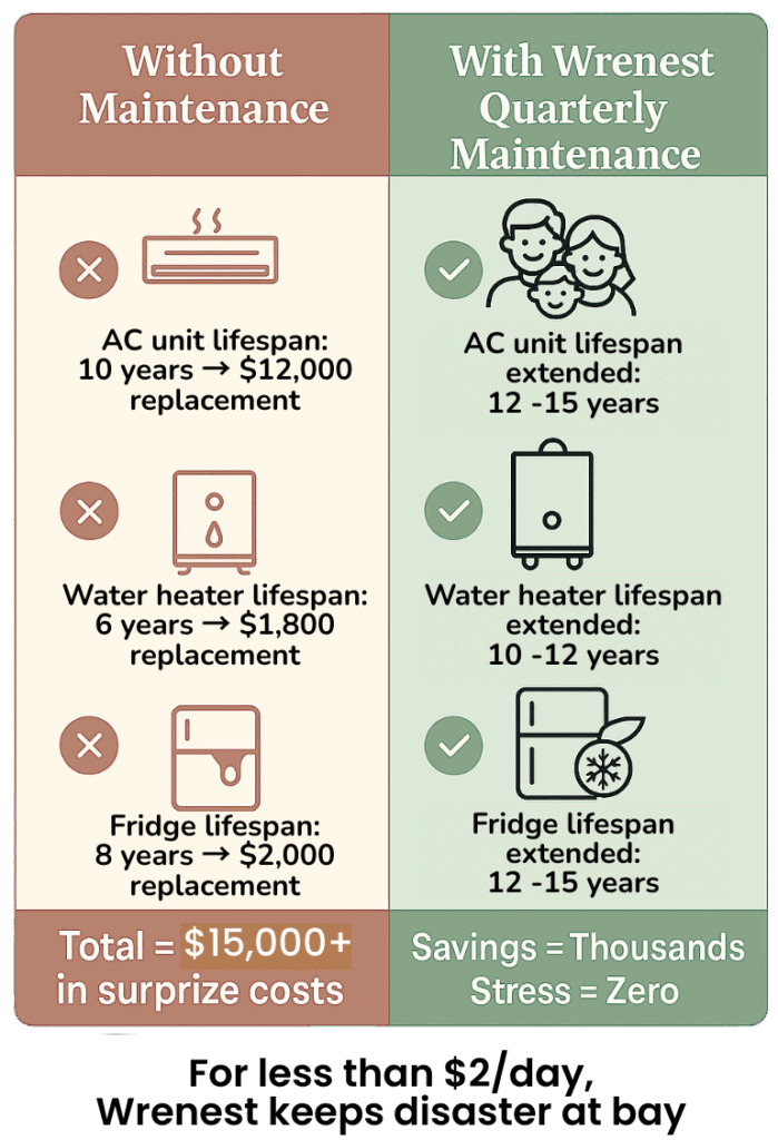 Every three months, your Wrenest Pro Tech takes care of the routine maintenance most people forget — things like filter swaps, vent cleanouts, and safety checks — so your home stays in top shape without the weekend headaches.